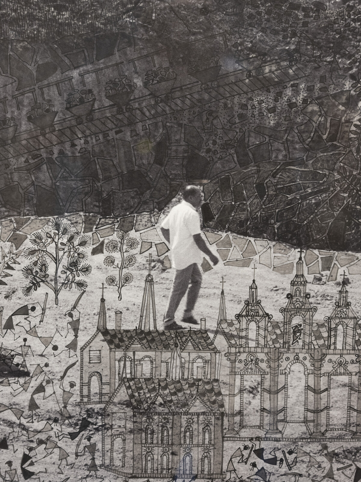 Gill and Vangad have been collaborating closely since 2013 to co-create painted photographs that marry different knowledge systems. The intricate overpaintings expand the present tense of the photograph to include vivid autobiographies and intangible mythologies, as well as transformations wrought by industrial civilization. In the triptych from the series Fields of Sight produced for Planetary Peasants, images from Ganjad merge with impressions gathered last year during Vangad’s sojourn in Halle and the surrounding area, creating a seemingly surreal glocal landscape.