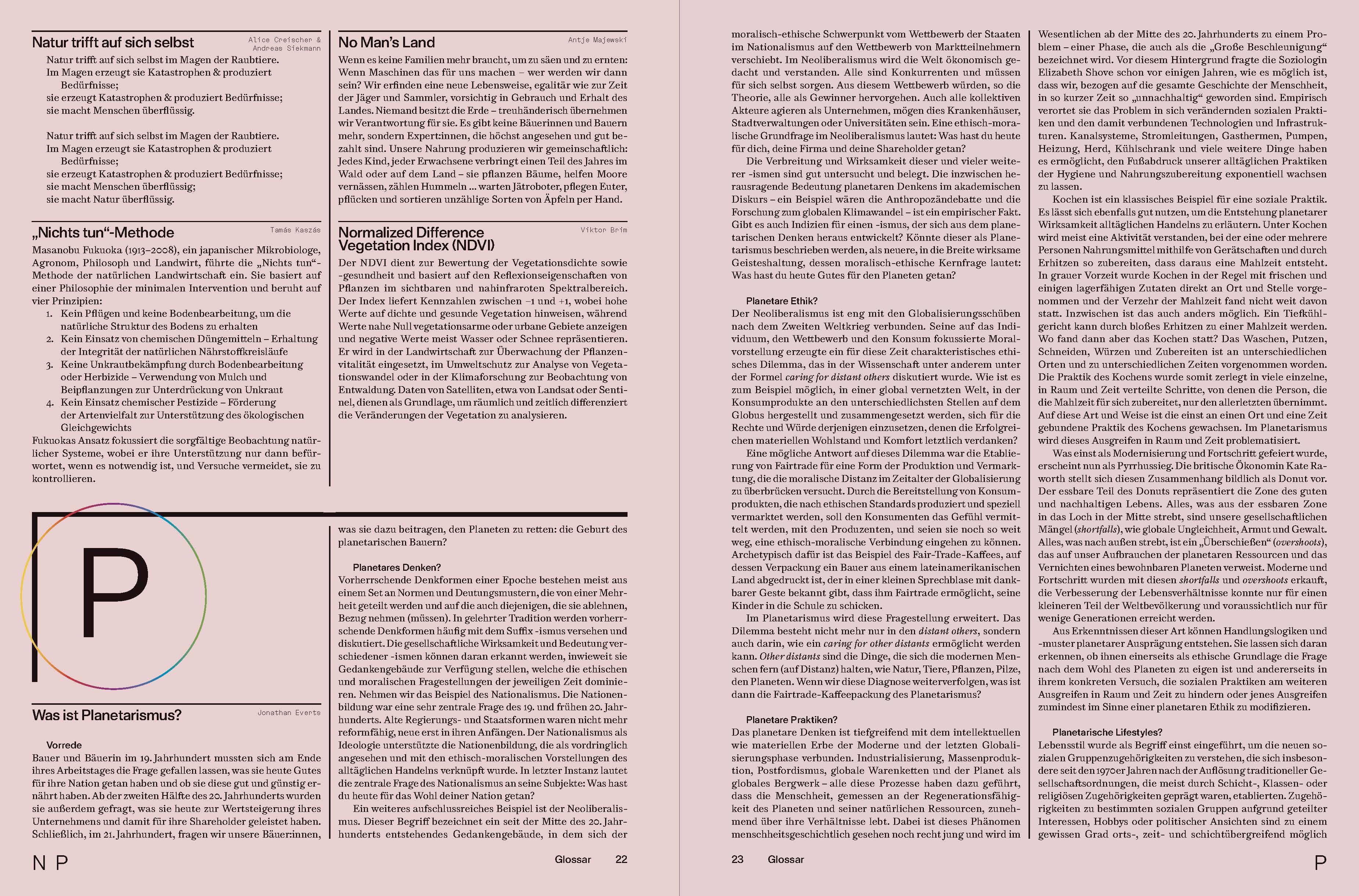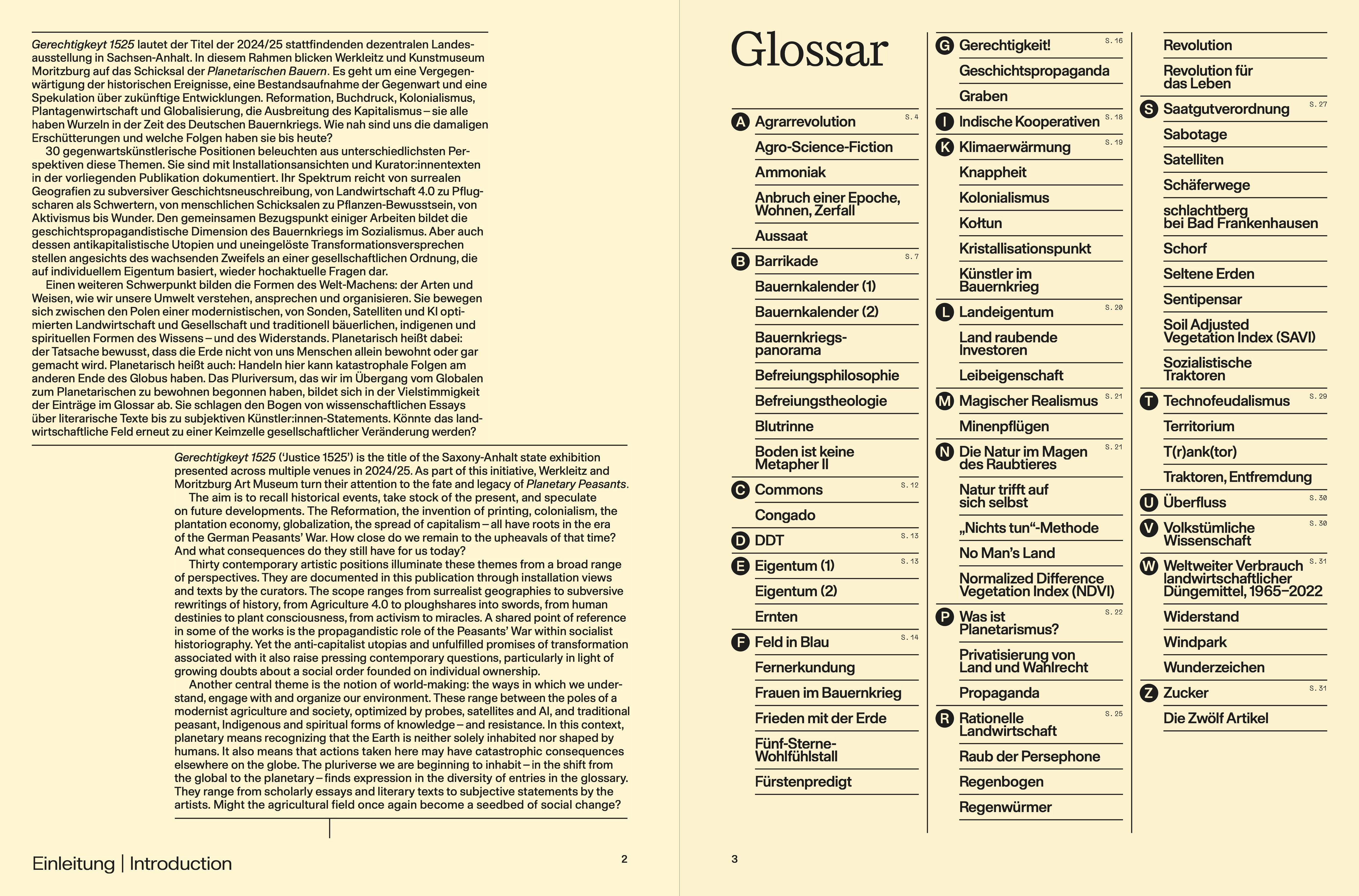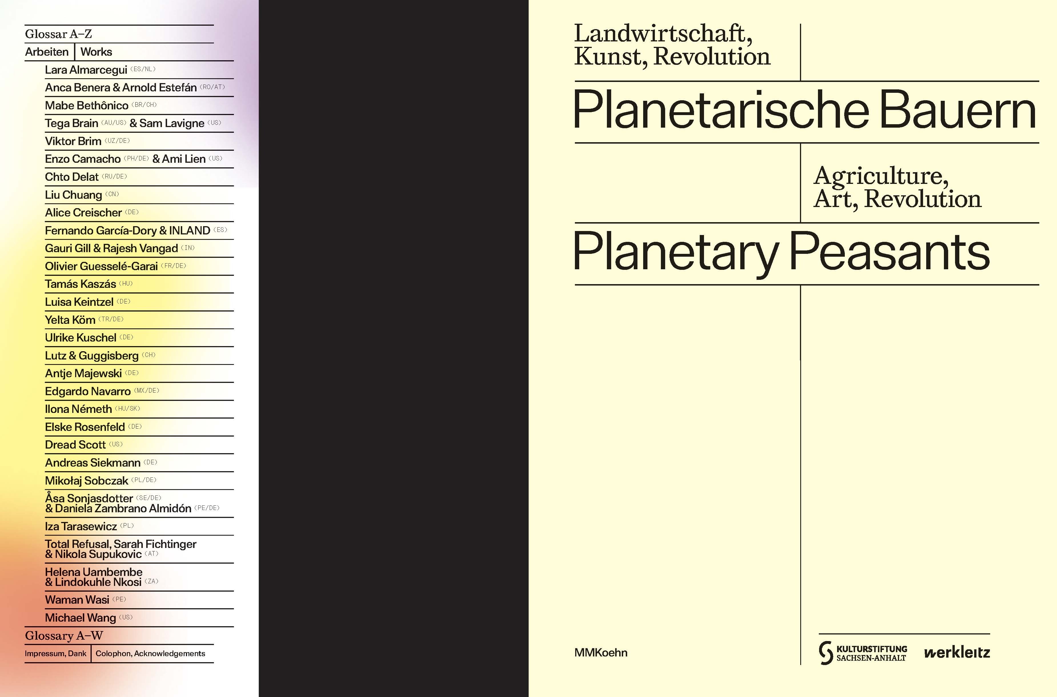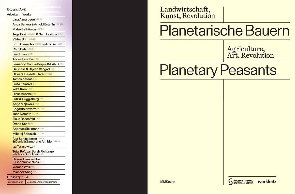 The bilingual (German-English) publication accompanying the exhibition Planetary Peasants presents an alphabetically ordered glossary on agriculture, art, and revolution, alongside exhibition texts and a documentation of all artistic works, in a magazine-format layout.