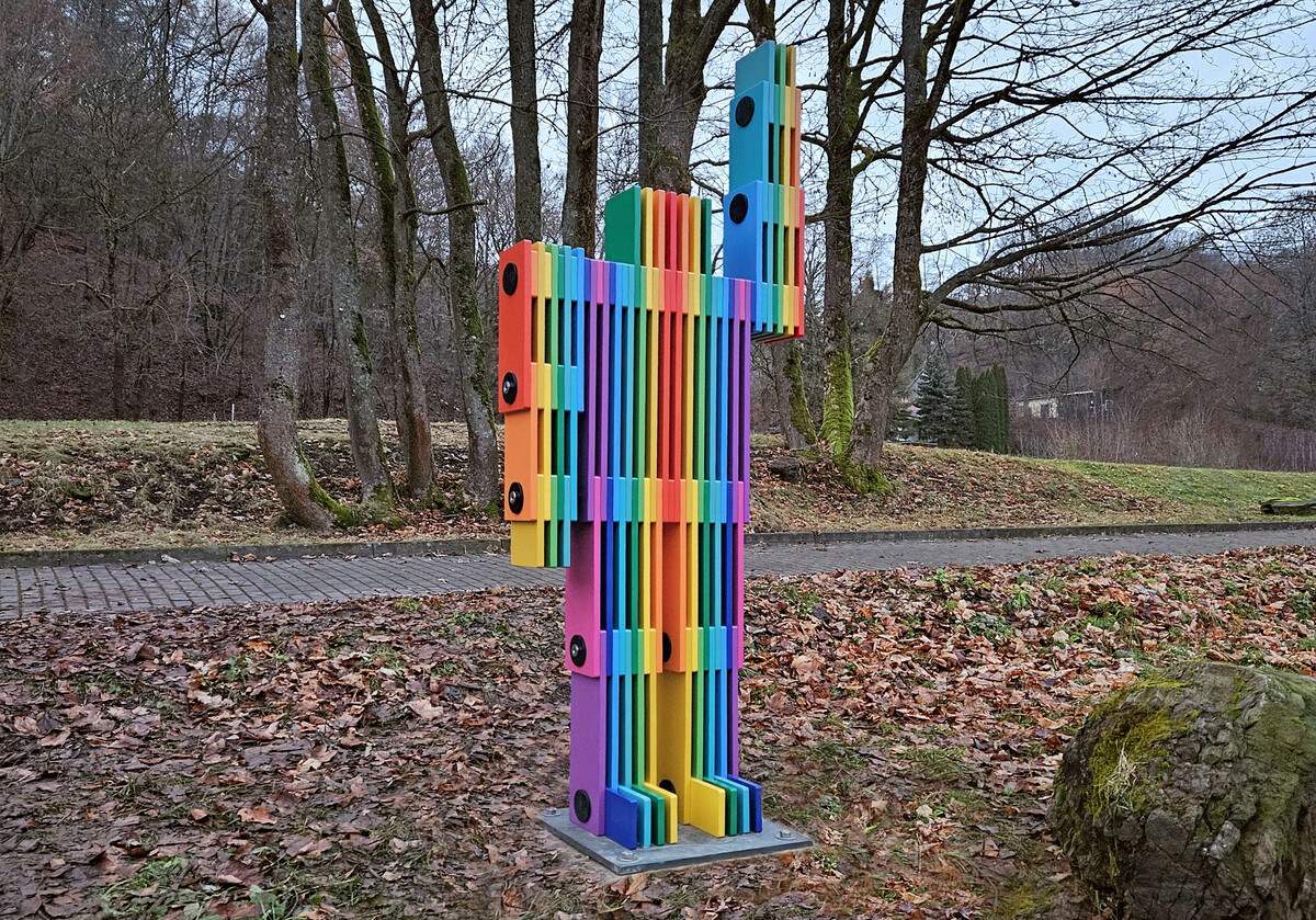 Robota 500 by Stine Albrecht and Hermann Beneke is a 2.70-meter-tall metal sculpture composed of vertically layered aluminum plates forming a humanoid figure. Painted in rainbow colors, the sculpture stands as both a symbol of the uprising of an instrumentalized class and a prompt to reflect on the technologization and automation of our natural ways of life. Its raised arm may be seen as a call to struggle—or as a gesture pointing toward a new era.