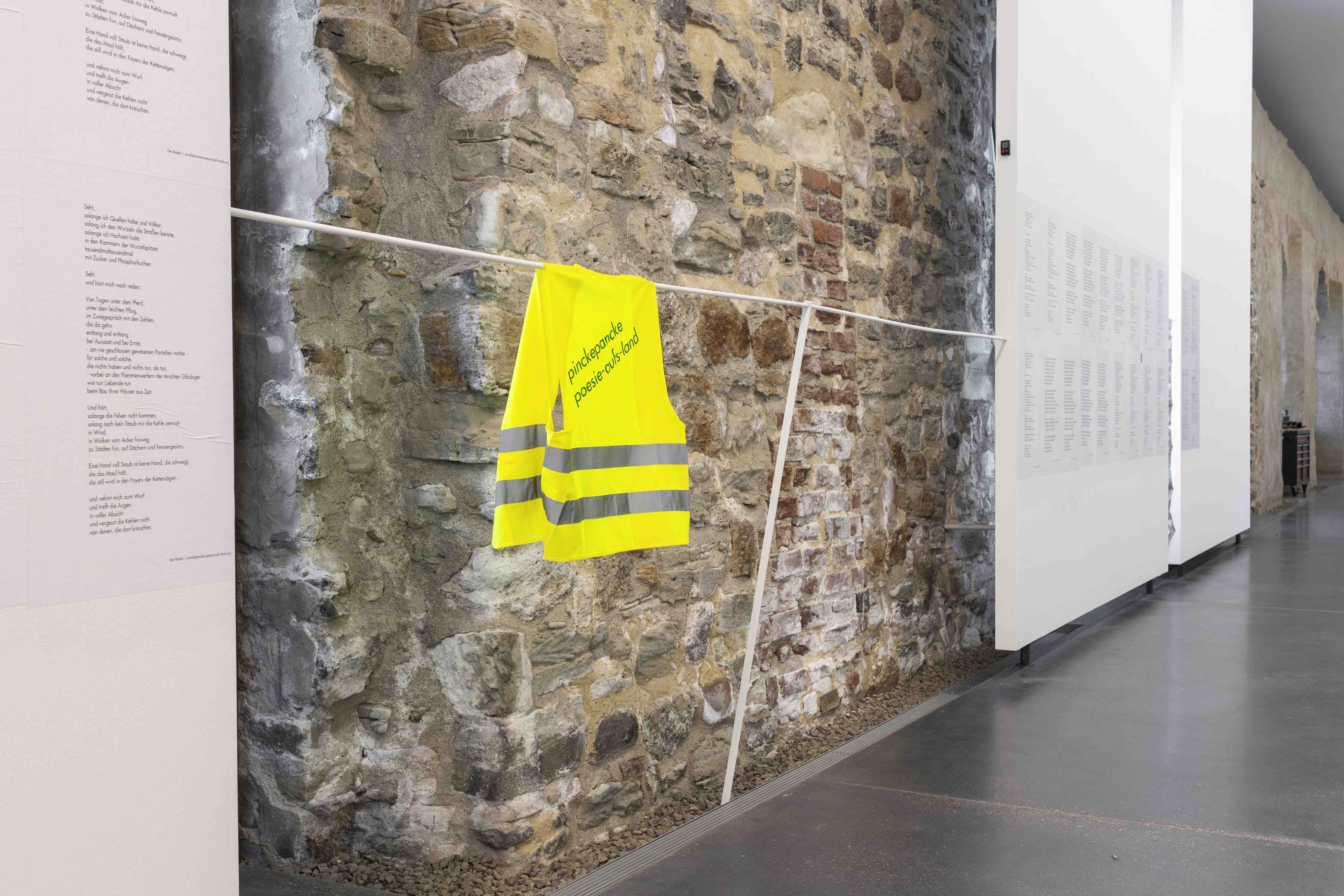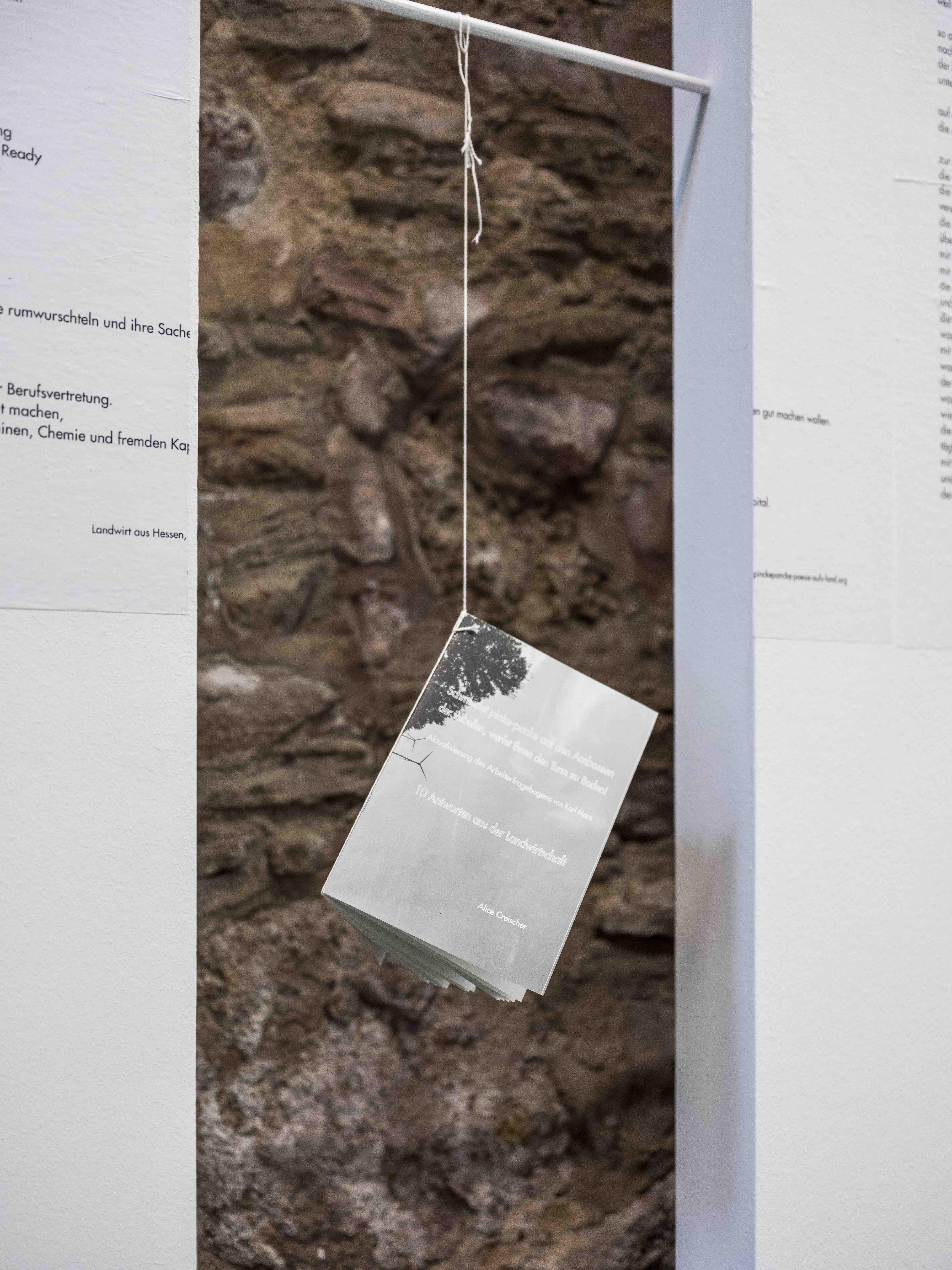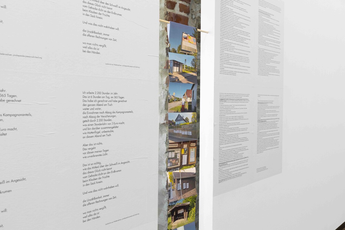Um gesellschaftspolitische und wirtschaftliche Fragen kreist die künstlerische Praxis von Alice Creischer (geb. 1960). In ihren interdisziplinären Projekten spielen Texte eine zentrale Rolle, die nicht allein Informationsträger und sprachästhetisches Kunstwerk, sondern auch visuelles Medium sind. Die in Berlin lebende Künstlerin befragt in ihrem aktuellen Projekt Bäuerinnen und Bauern, unter anderem im Mansfelder Land, zu deren Produktions- und Lebensbedingungen und orientiert sich dabei am historischen „Fragebogen für Arbeiter“, mit dem Karl Marx 1880 die Situation der französischen Arbeiterklasse untersuchte. Alice Creischer verwandelt die Äußerungen aus ihren Interviews, aber auch historische Quellen und ein fiktives Gespräch mit einem Hausschwein in lyrische Texte. Sie sind als Plakate in der Ausstellung und im öffentlichen Raum zu sehen und über QR-Codes auch auf der Werkleitz-Website abrufbar: „hin und zurück und hin und / morgens und abends und morgens / und dazwischen die gezählten Stunden, / die ungezählt bleiben bei uns […].“