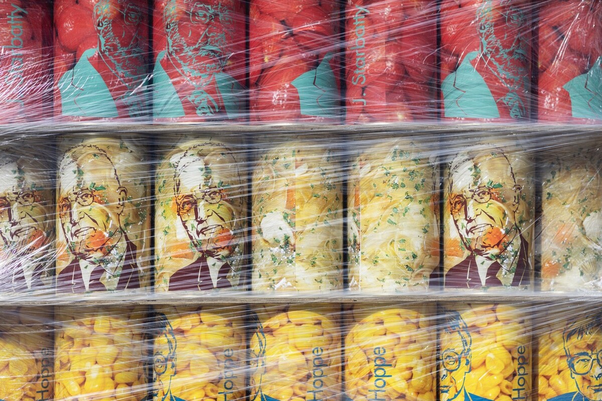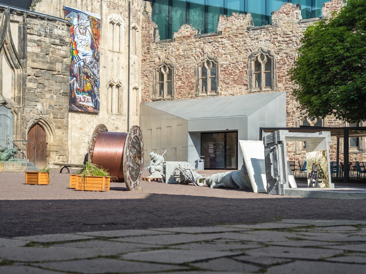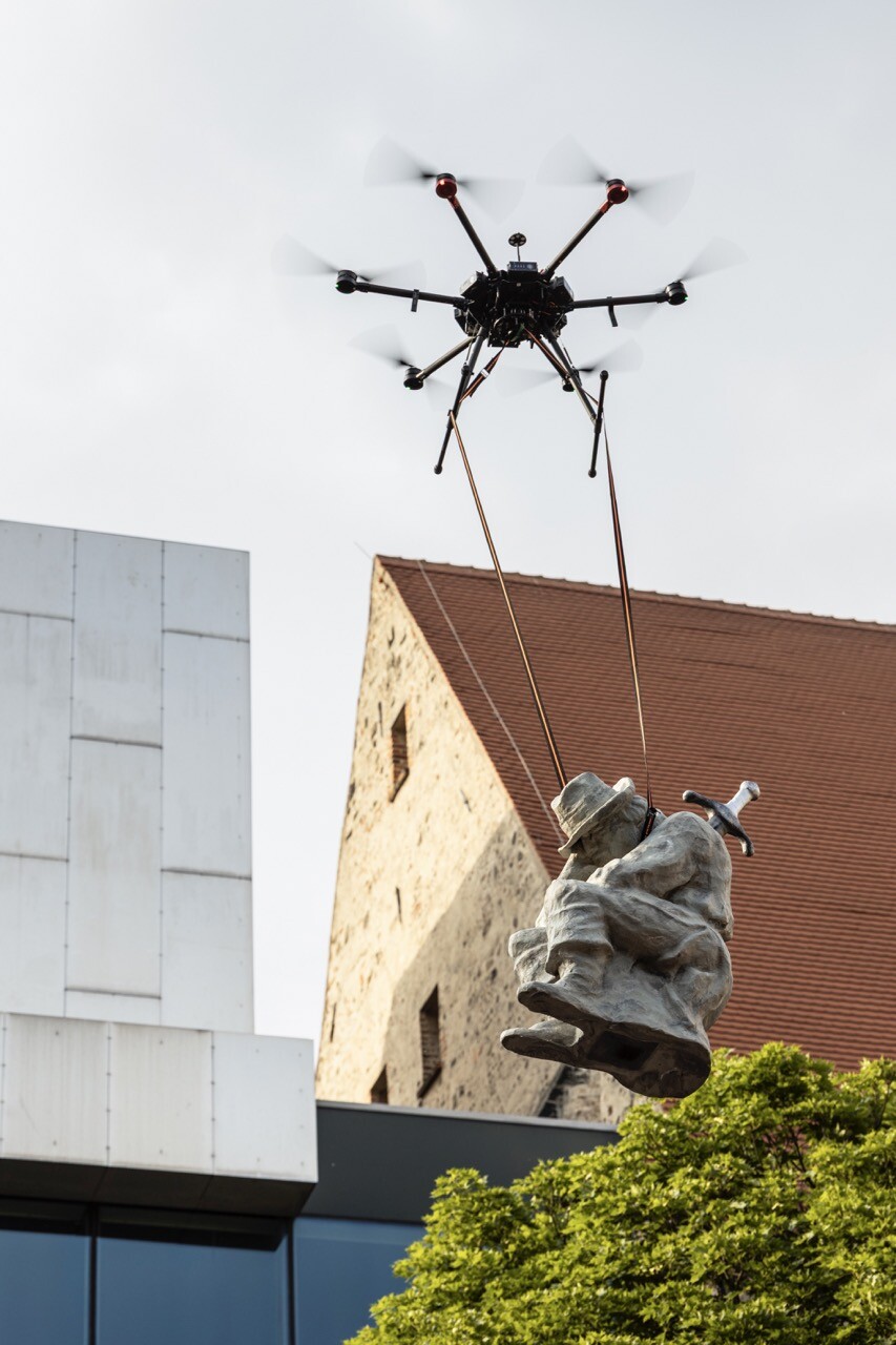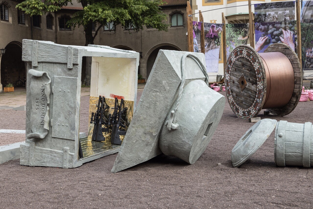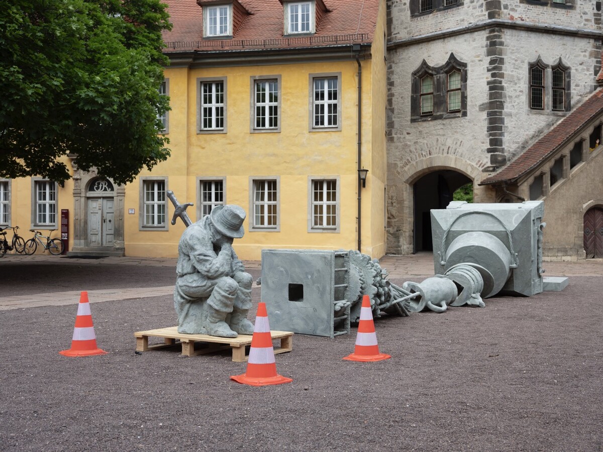 Als Albrecht Dürer 1525 das Denkmal für die besiegten Bauern entwarf, wollte er damit seine ideale Proportionslehre illustrieren. Das Blatt findet sich in seinem Lehrbuch der praktischen Geometrie, zur Ausführung war der Entwurf nie gedacht. Andreas Siekmann (geb. 1961 in Hamm, lebt in Berlin) interpretiert Dürers Säule aus Weizenähren, Arbeitsgerät, Hühnerkörben und einem rücklings gemeuchelten Bauern, dem das Schwert noch im Rücken steckt, zeitgemäß, indem er die Tierallegorien des Sockels durch aktuelle Sinnbilder ersetzt. Gestapelte Konservendosen, eine Kabeltrommel mit Kupferdraht, ein ausrangierter Greifarm-Automat und ein Waffenständer flankieren seine Styroporsäule wie Symbole einer bedrohlichen und bedrohten Ökonomie. Das Denkmal liegt gestürzt am Boden im Hof der Moritzburg. Vergeblich müht sich eine Lastendrohne, den Bauern wieder aufzurichten. Die vernichtende Niederlage der Landbevölkerung wird so doppelt anschaulich. Ironischerweise hat man gerade im thüringischen Mühlhausen, etwa 150 Kilometer entfernt, die Säule nach Dürers Entwürfen sieben Meter hoch aus Bronze errichtet – zur Erinnerung an den Bauernkrieg 1524/25.