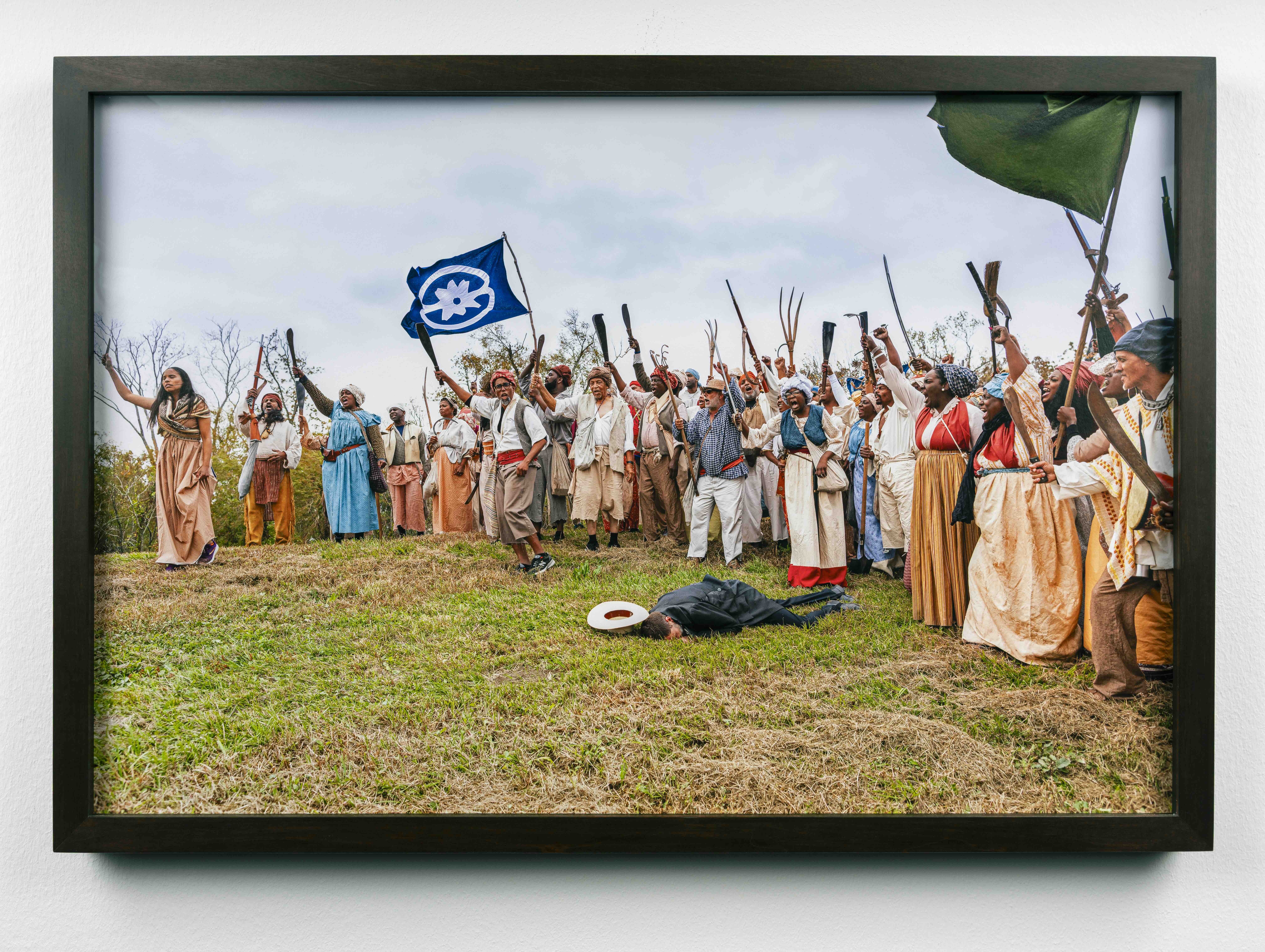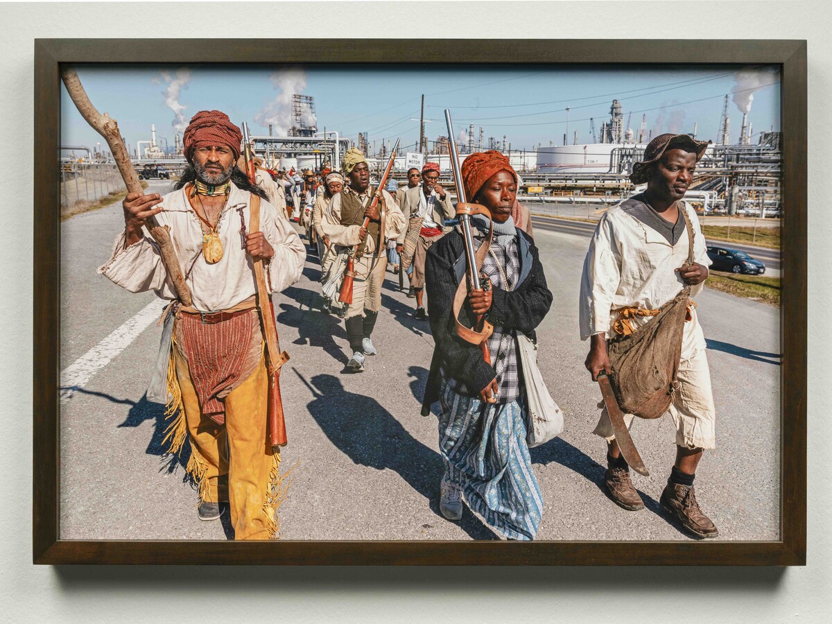 Die konzeptuellen Aktionen des in New York lebenden Künstlers Dread Scott (geb. 1965 in Chicago) nehmen Sklaverei, Kolonialismus und Extraktivismus als historische Grundpfeiler der modernen Gesellschaft ins Visier. Sein Re-Enactment eines Sklavenaufstands an der „German Coast“ in Louisiana 1811 – der größten Rebellion von Sklav:innen in der Geschichte der USA –, unter Mitwirkung Hunderter schwarzer Personen und Angehöriger der First Nations, verdeutlicht dies eindrucksvoll. Nur eine bescheidene Tafel an einer vielbefahrenen Kreuzung „erinnert“ offiziell an diesen Schlüsselmoment, den vor allem die aktivistische Forschung zu bewahren suchte. Die von Dread Scott initiierte und von John Akomfrah gefilmte Reinszenierung wurde zu einem wegweisenden Akt kollektiver Erinnerung, der ein revolutionäres Kapitel der US-Geschichte, inspiriert durch die Haitianische Revolution von 1791, wiederaneignet. Obgleich der Aufstand von 1811 letztlich nicht zur Einnahme von New Orleans und zur Abschaffung der Sklaverei führte, ebnete er doch den Weg für viele wirksame Formen späteren Widerstands.