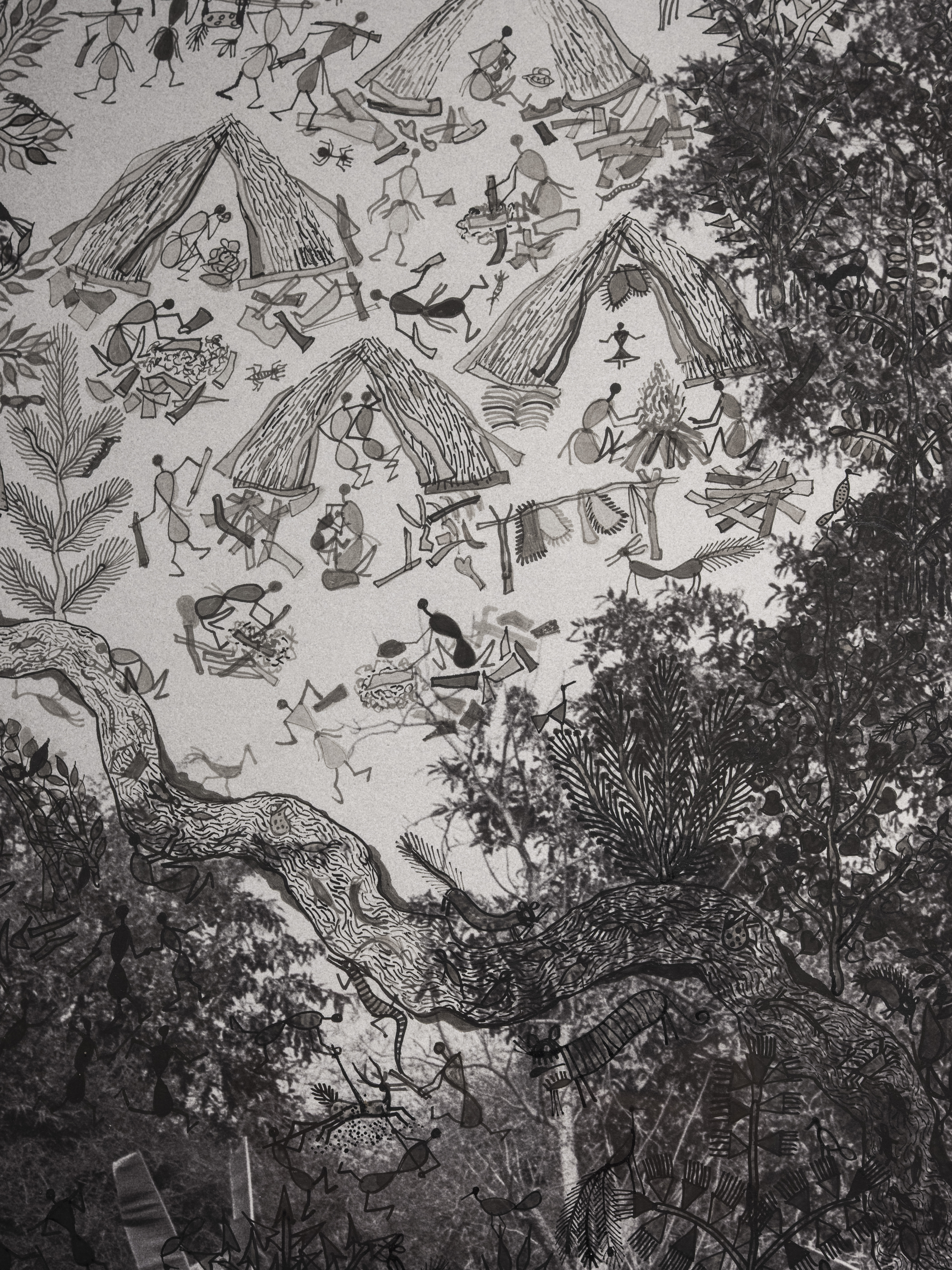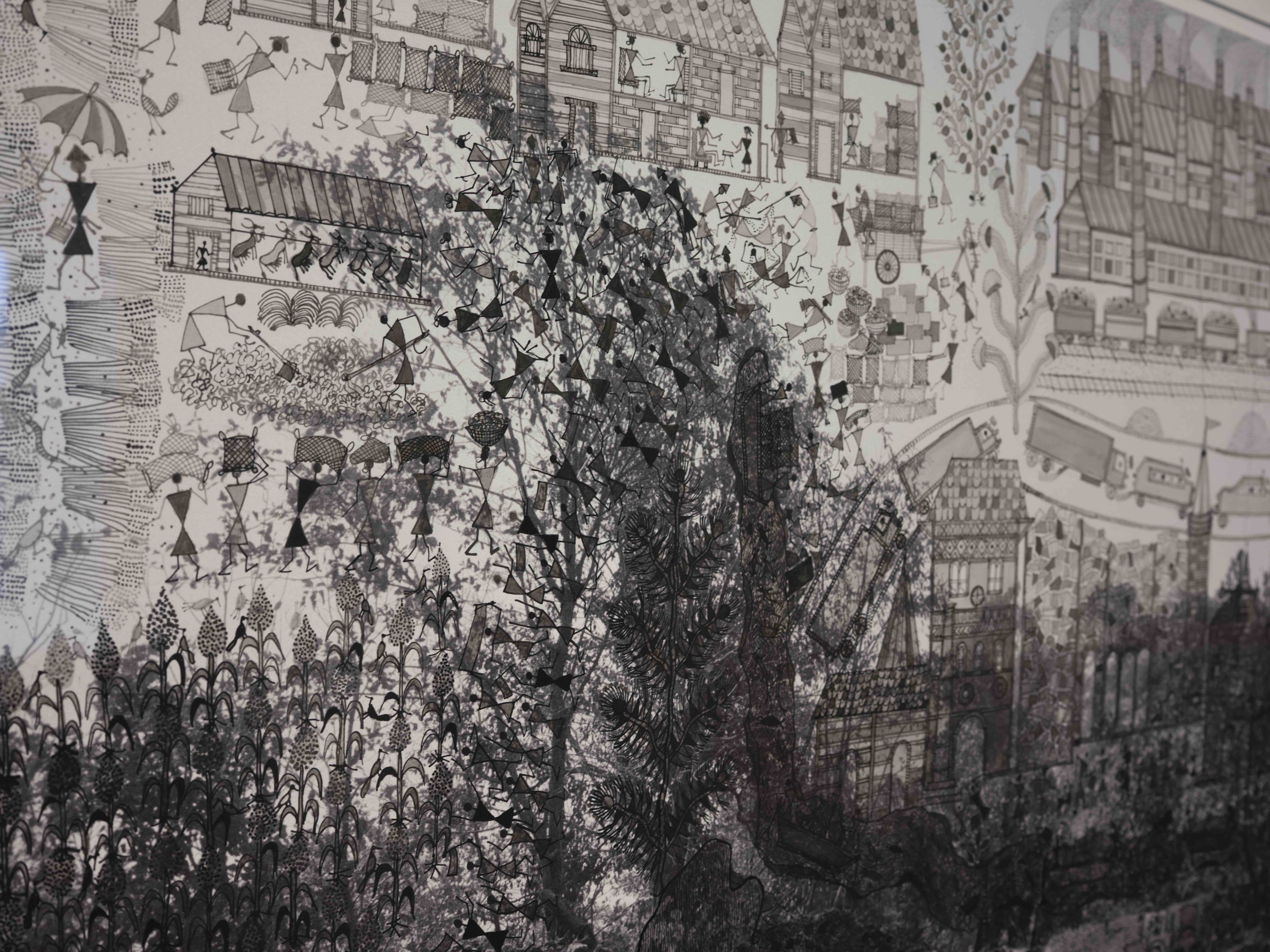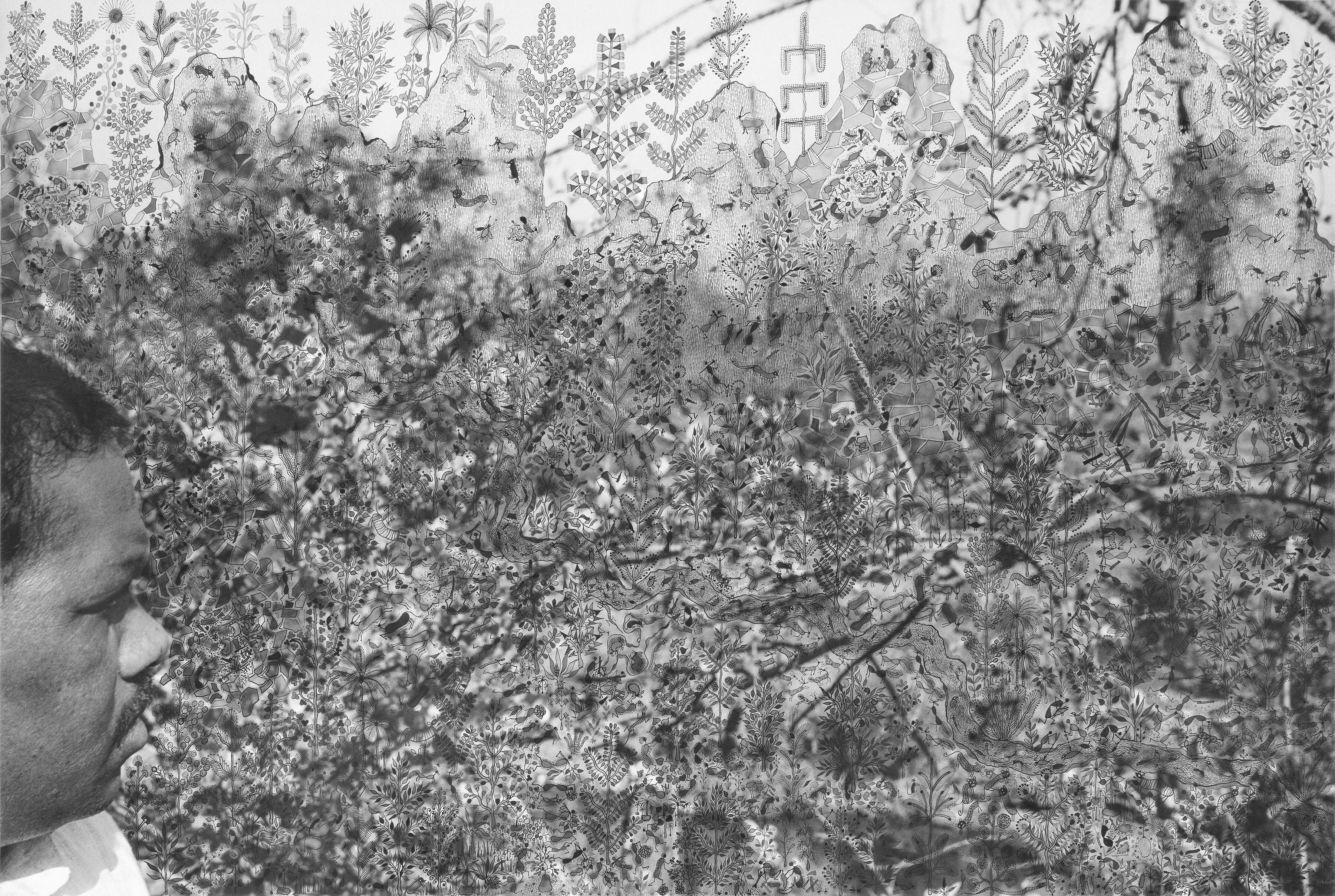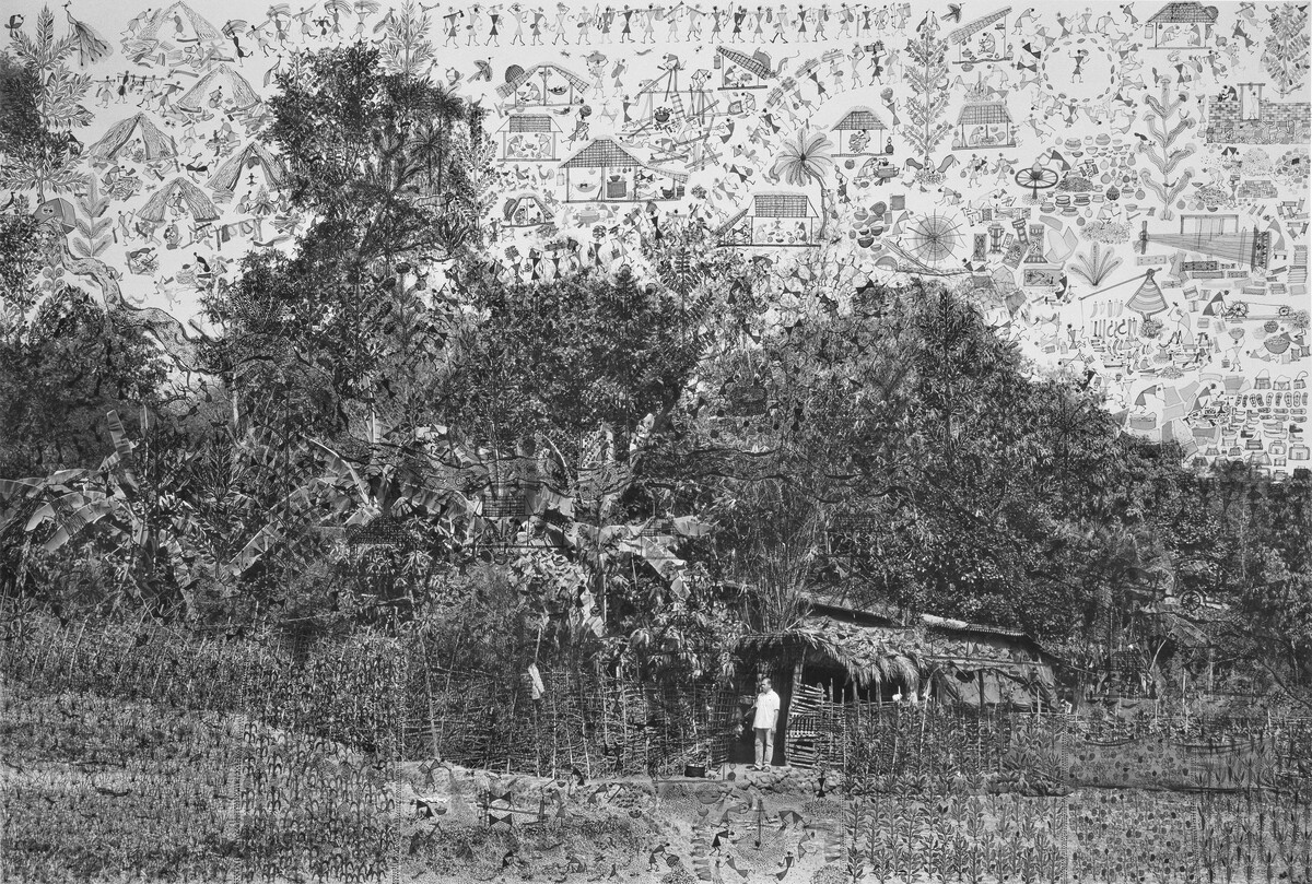 Die Fotografin Gauri Gill (geb. 1970 in Chandigarh, Indien) lebt in der Riesenmetropole Delhi, pflegt aber enge Beziehungen zum Leben auf dem Land. In ihren künstlerischen und dokumentarischen Serien kehrt sie immer wieder zum Schicksal marginalisierter Gruppen wie indigenen Gemeinschaften, Migrant:innen, Nomad:innen und Kleinbäuer:innen zurück. Der Maler Rajesh Vangad (geb. 1975 in Ganjad, Indien) ist im Westen Indiens auf dem Land aufgewachsen. Er entstammt dem kleinen indigenen Volk der Warli und ist ein herausragender Vertreter ihrer traditionellen Maltechnik. Seit 2013 arbeiten Gill und Vangad zusammen. Die filigranen Übermalungen Vangads erweitern die Fotografie um lebendige autobiografische Erzählungen und immaterielle Mythologien sowie um Spuren der Umformungen durch die industrielle Zivilisation. Auf dem für Planetarische Bauern entstandenen Triptychon vermischen sich Bilder aus Ganjad mit Eindrücken, die er von seinem letztjährigen Aufenthalt in Halle und Umgebung mitgenommen hat, zu einer surreal anmutenden glokalen Landschaft.