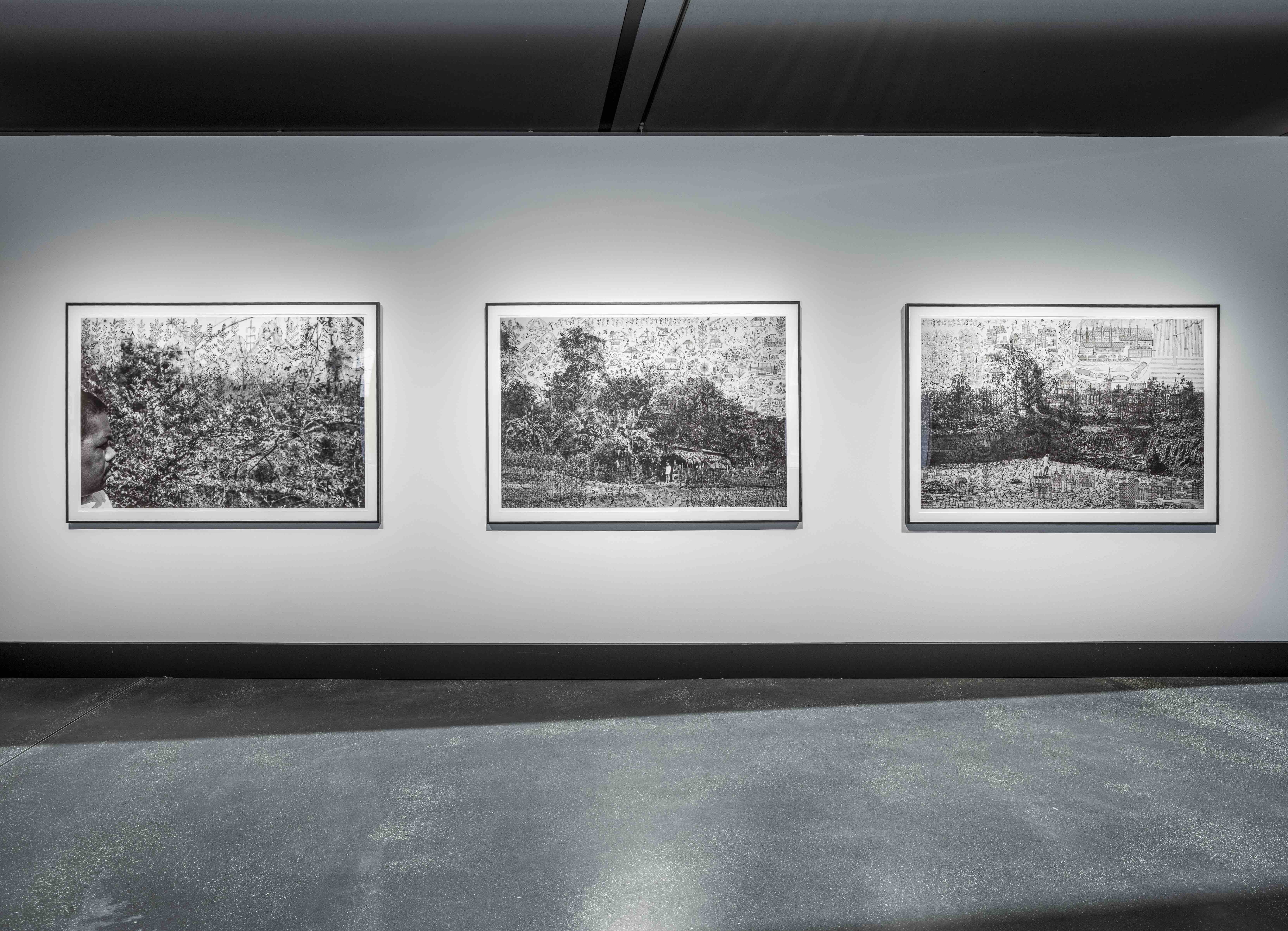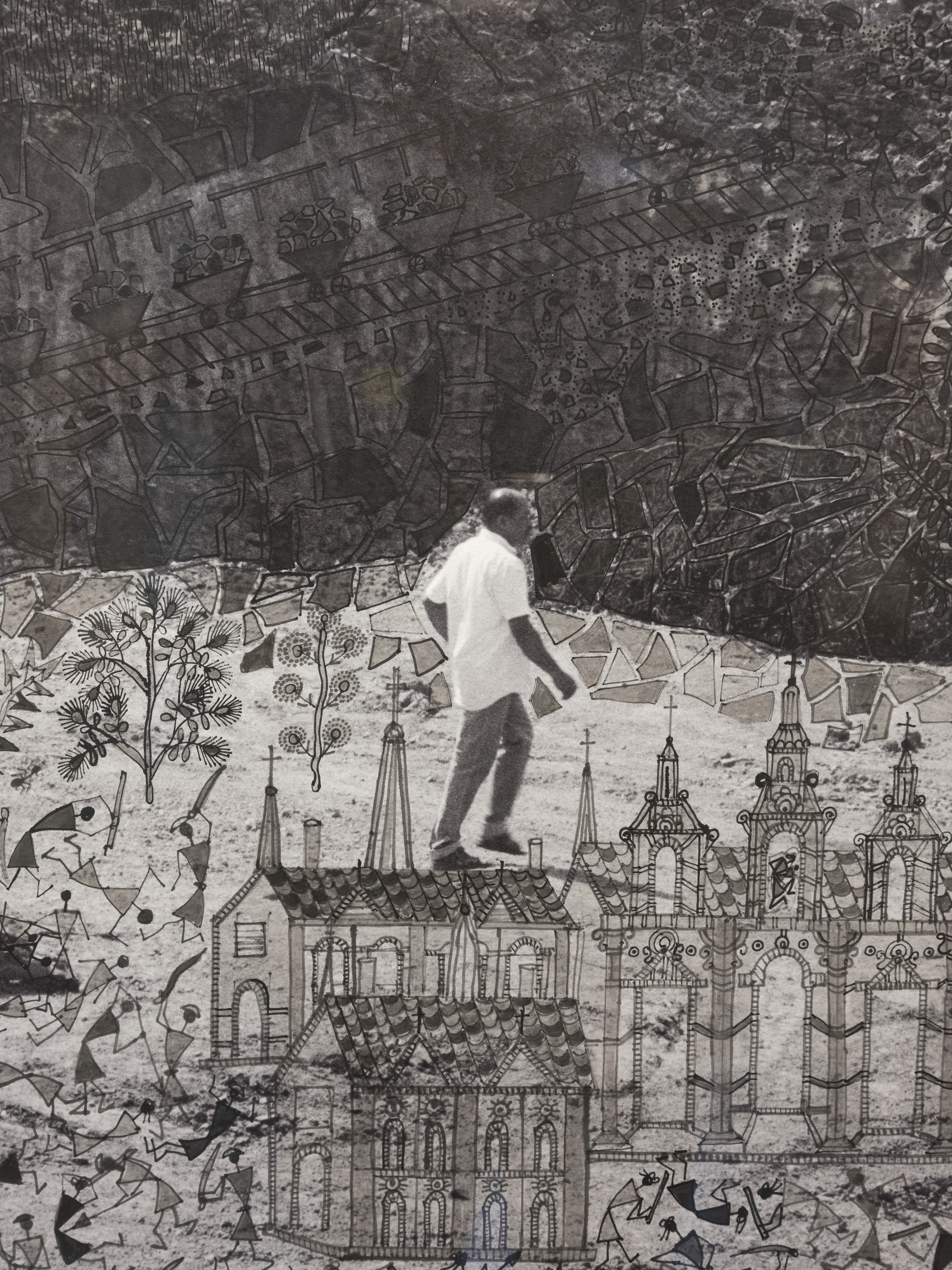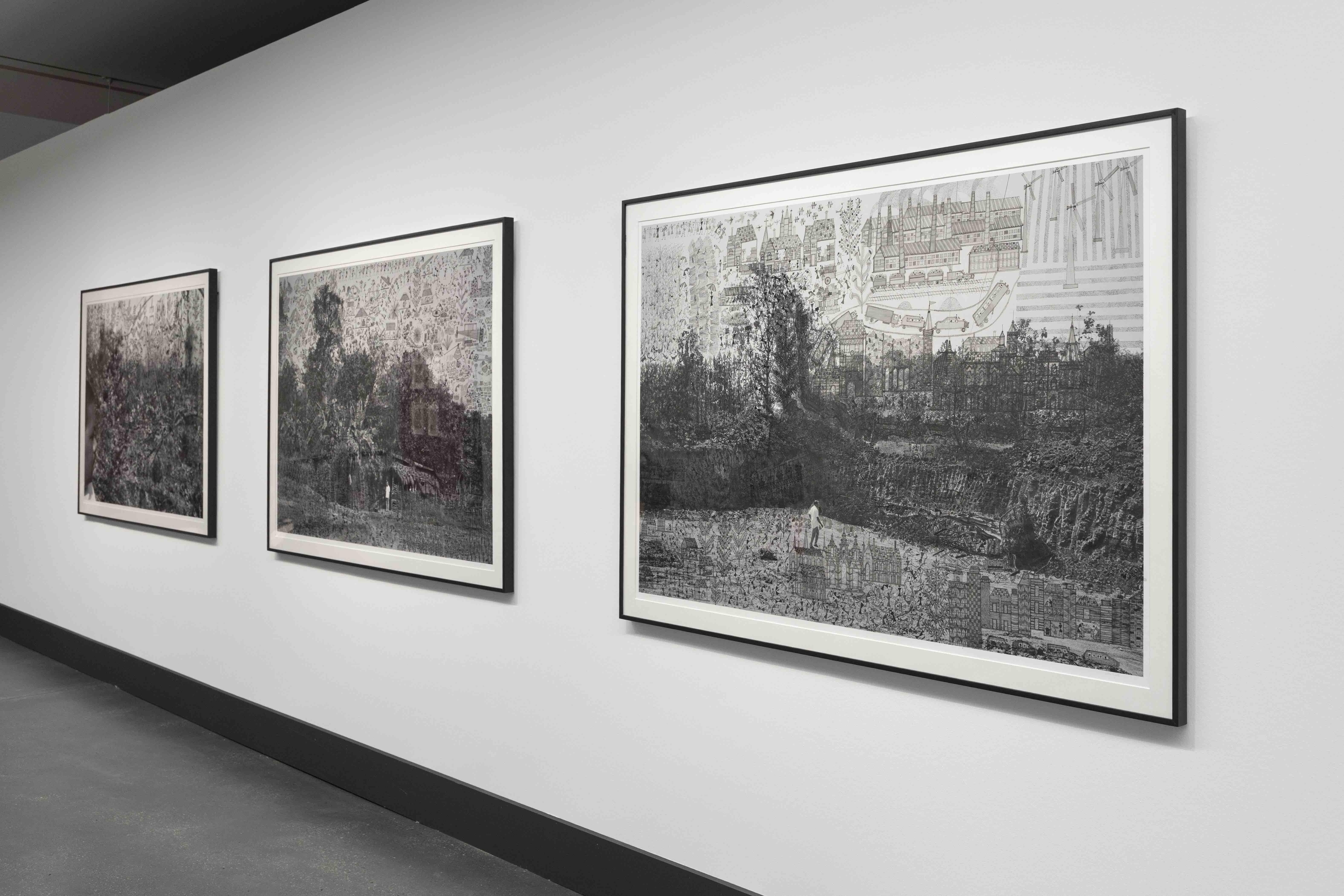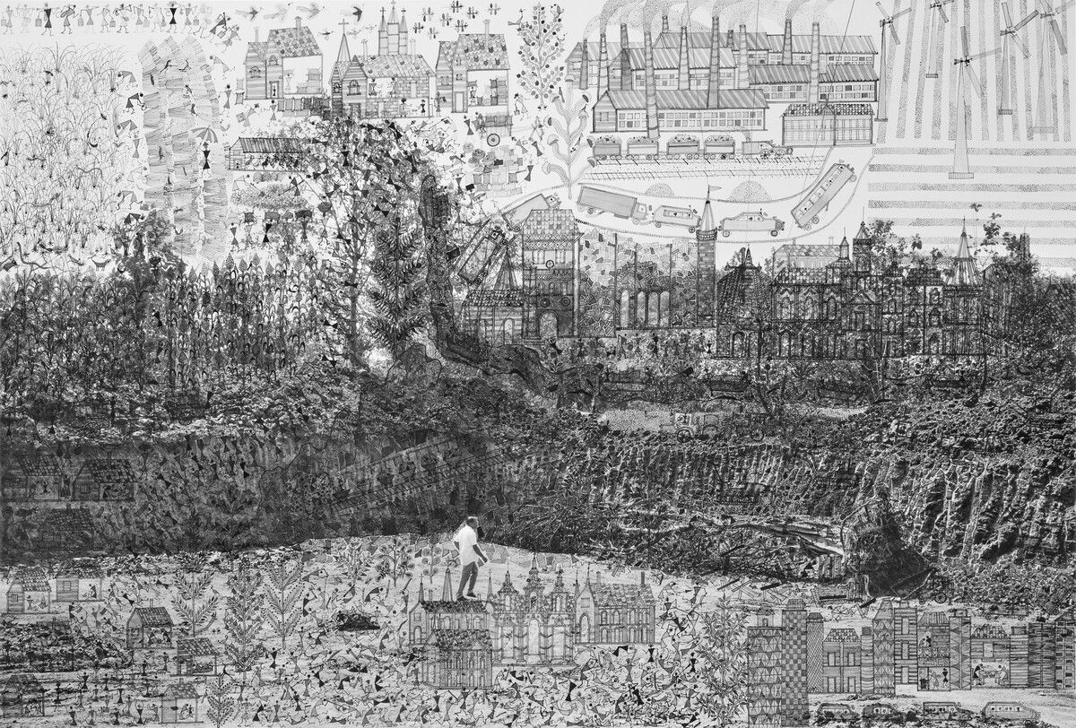 Die Fotografin Gauri Gill (geb. 1970 in Chandigarh, Indien) lebt in der Riesenmetropole Delhi, pflegt aber enge Beziehungen zum Leben auf dem Land. In ihren künstlerischen und dokumentarischen Serien kehrt sie immer wieder zum Schicksal marginalisierter Gruppen wie indigenen Gemeinschaften, Migrant:innen, Nomad:innen und Kleinbäuer:innen zurück. Der Maler Rajesh Vangad (geb. 1975 in Ganjad, Indien) ist im Westen Indiens auf dem Land aufgewachsen. Er entstammt dem kleinen indigenen Volk der Warli und ist ein herausragender Vertreter ihrer traditionellen Maltechnik. Seit 2013 arbeiten Gill und Vangad zusammen. Die filigranen Übermalungen Vangads erweitern die Fotografie um lebendige autobiografische Erzählungen und immaterielle Mythologien sowie um Spuren der Umformungen durch die industrielle Zivilisation. Auf dem für Planetarische Bauern entstandenen Triptychon vermischen sich Bilder aus Ganjad mit Eindrücken, die er von seinem letztjährigen Aufenthalt in Halle und Umgebung mitgenommen hat, zu einer surreal anmutenden glokalen Landschaft.