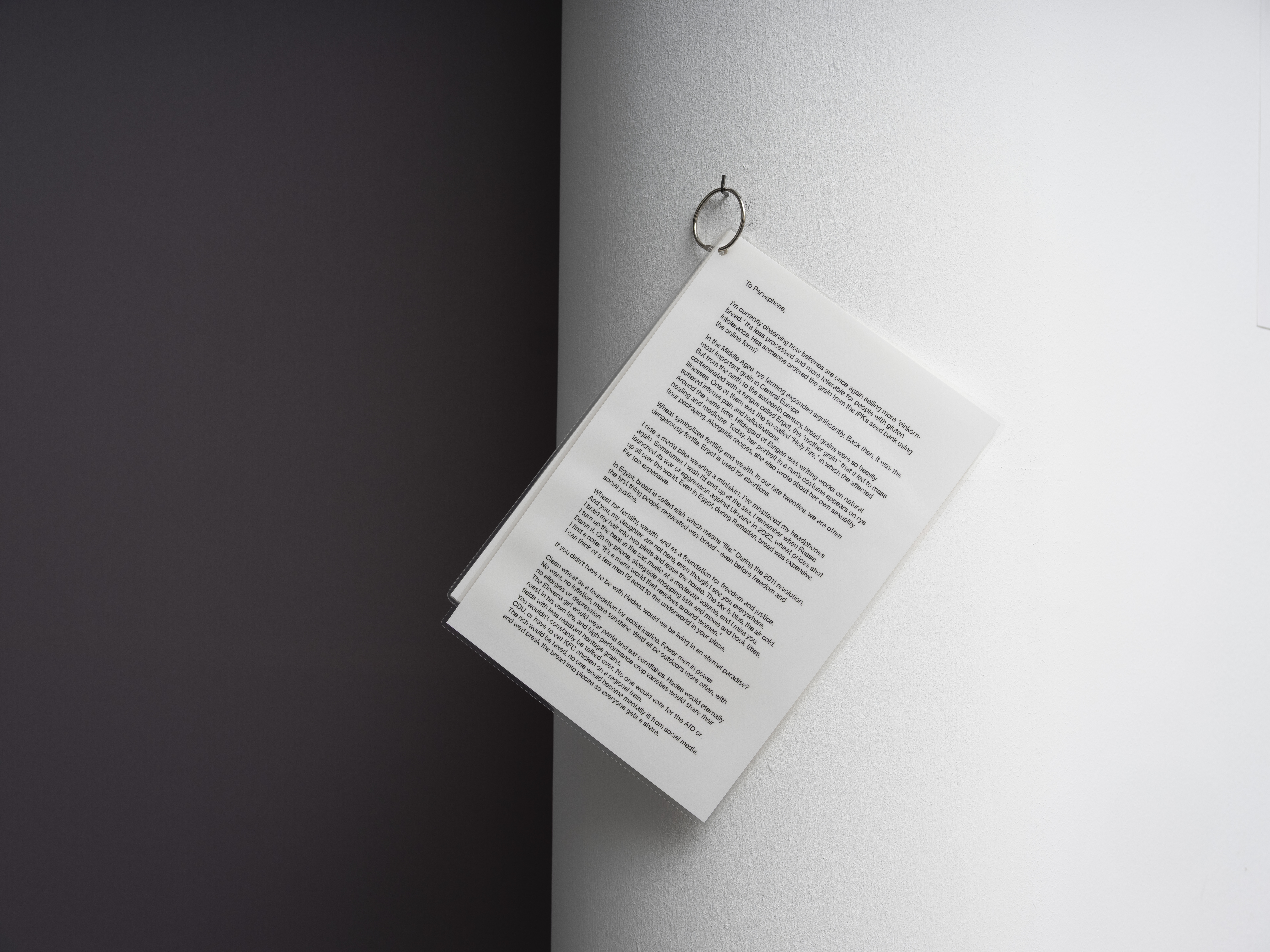 Schwere Siloschutzgitter bedecken die aufgetürmten Strohballen, darüber liegt ein grauer Himmel. Farb- und freudlos wirkt der Winter in der Landwirtschaft, dessen Atmosphäre Luisa Keintzel (geb. 1996), Absolventin der Burg Giebichenstein Kunsthochschule Halle, in Fotoarbeiten und Texten einfängt. Dabei verknüpft ihr Projekt Covered die Bedingungen auf den Höfen mit der Geschichte von Persephone aus der griechischen Mythologie. Die Tochter der Demeter und des Zeus wurde von Hades in die Unterwelt entführt. Ihre Mutter erzwang, dass Persephone zyklisch an die Erdoberfläche zurückkehren durfte, nur für einen Teil des Jahres musste sie in der dunklen Unterwelt bleiben. So erklärte man sich die fruchtlose Winterzeit. Dagegen verkörpert Persephones Rückkehr ans Licht den Frühling und die Vegetation. In fiktiven Briefen lässt Keintzel aus feministischer Perspektive die Mutter-Tochter-Beziehung aufleben. Würden wir im ewigen Paradies leben – ohne den Raub der Persephone?