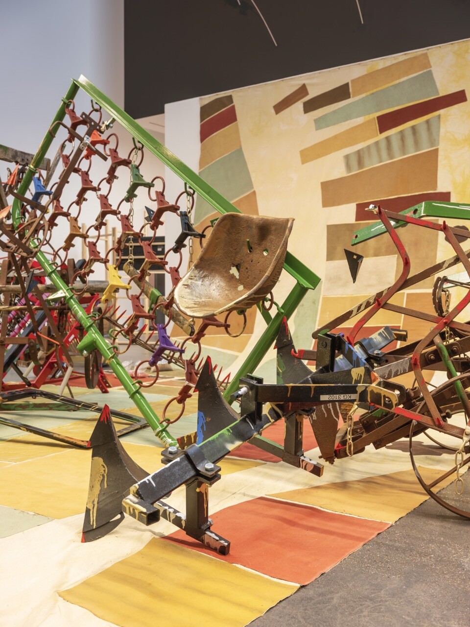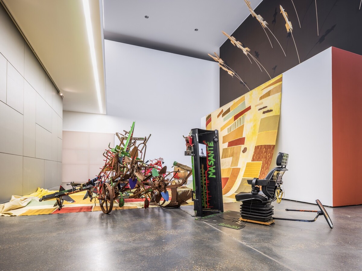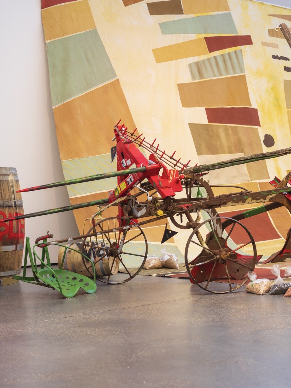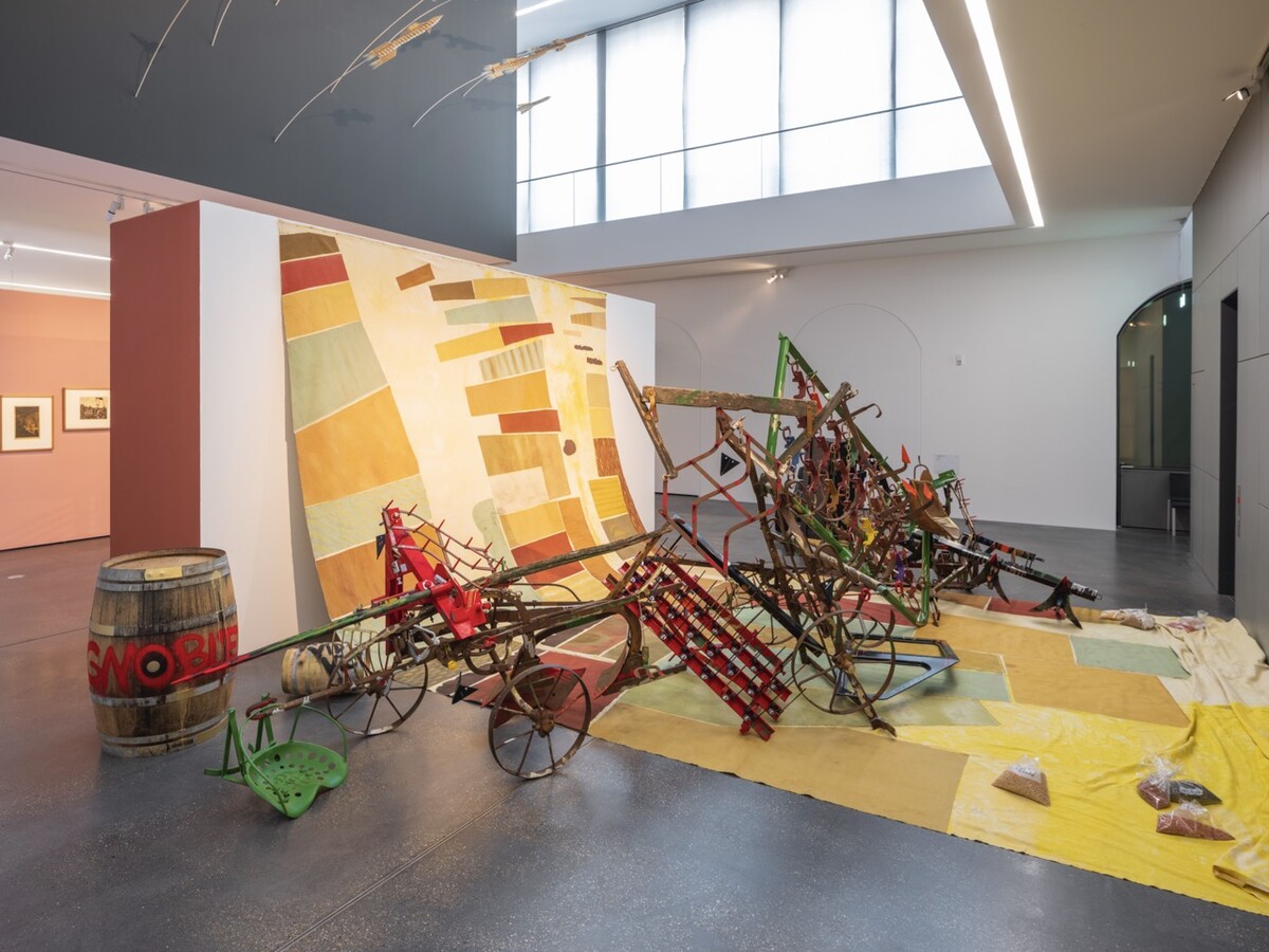Guesselé-Garai schuf eine Installation aus Eichenfässern, Dreschflegeln, Sicheln, Schaufeln, Zugmaschinen, elektronischen Bauteilen, Melkschemeln, Stiefeln, Kübeln und Rädern aus den letzten zwei Jahrhunderten. Szenen historischen und gegenwärtigen Widerstands in ländlichen Kontexten treten vor das innere Auge: Volksaufstände, soziale Konflikte, der Trotz der Leibeigenen, Revolten von Arbeiter:innen und Streiks – der fortwährende Kampf für soziale Gerechtigkeit und Gemeinschaftsgüter.