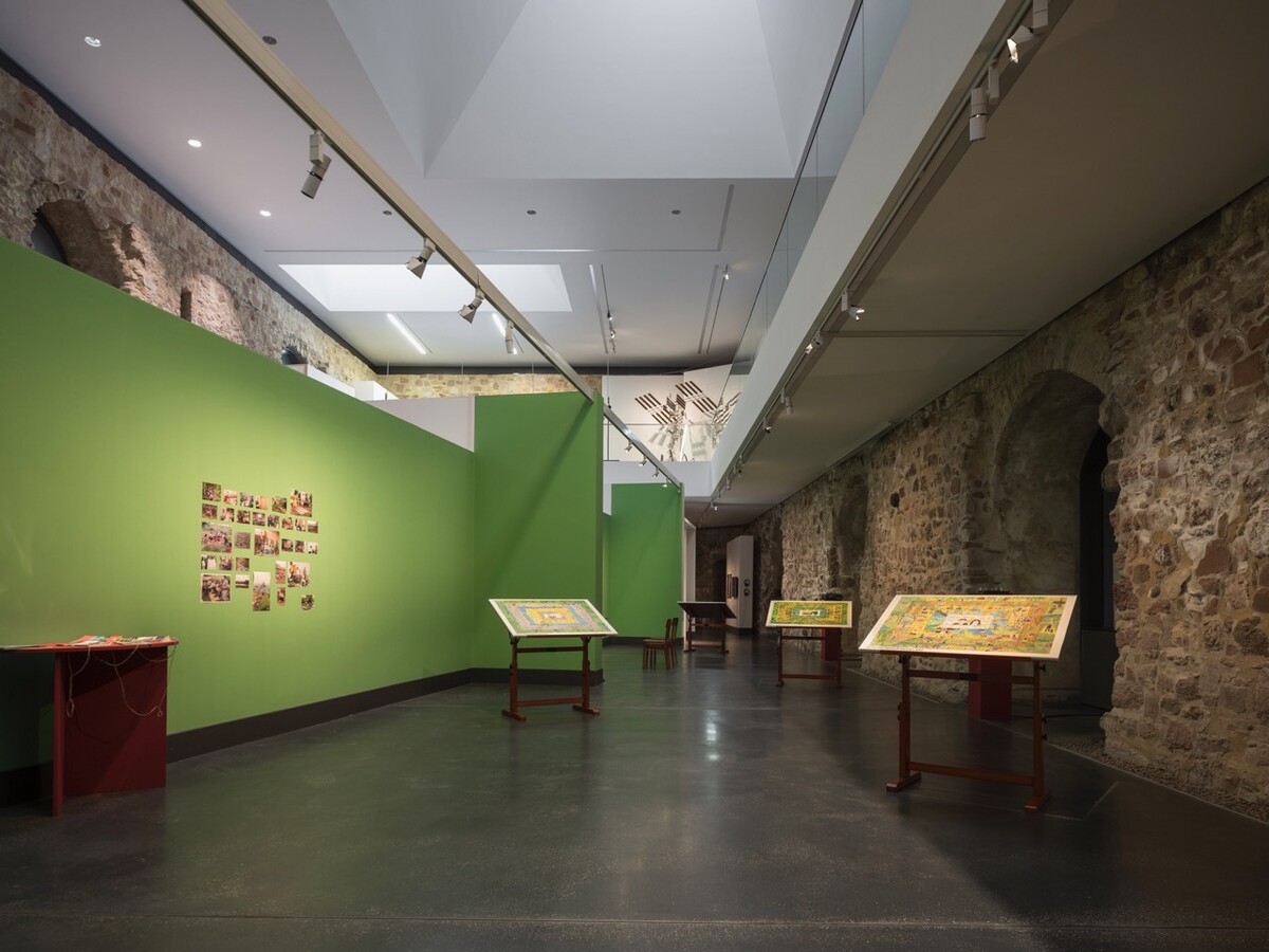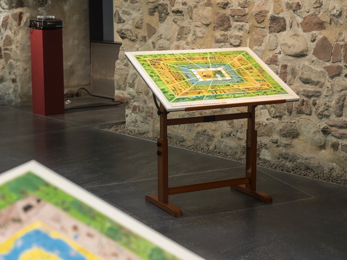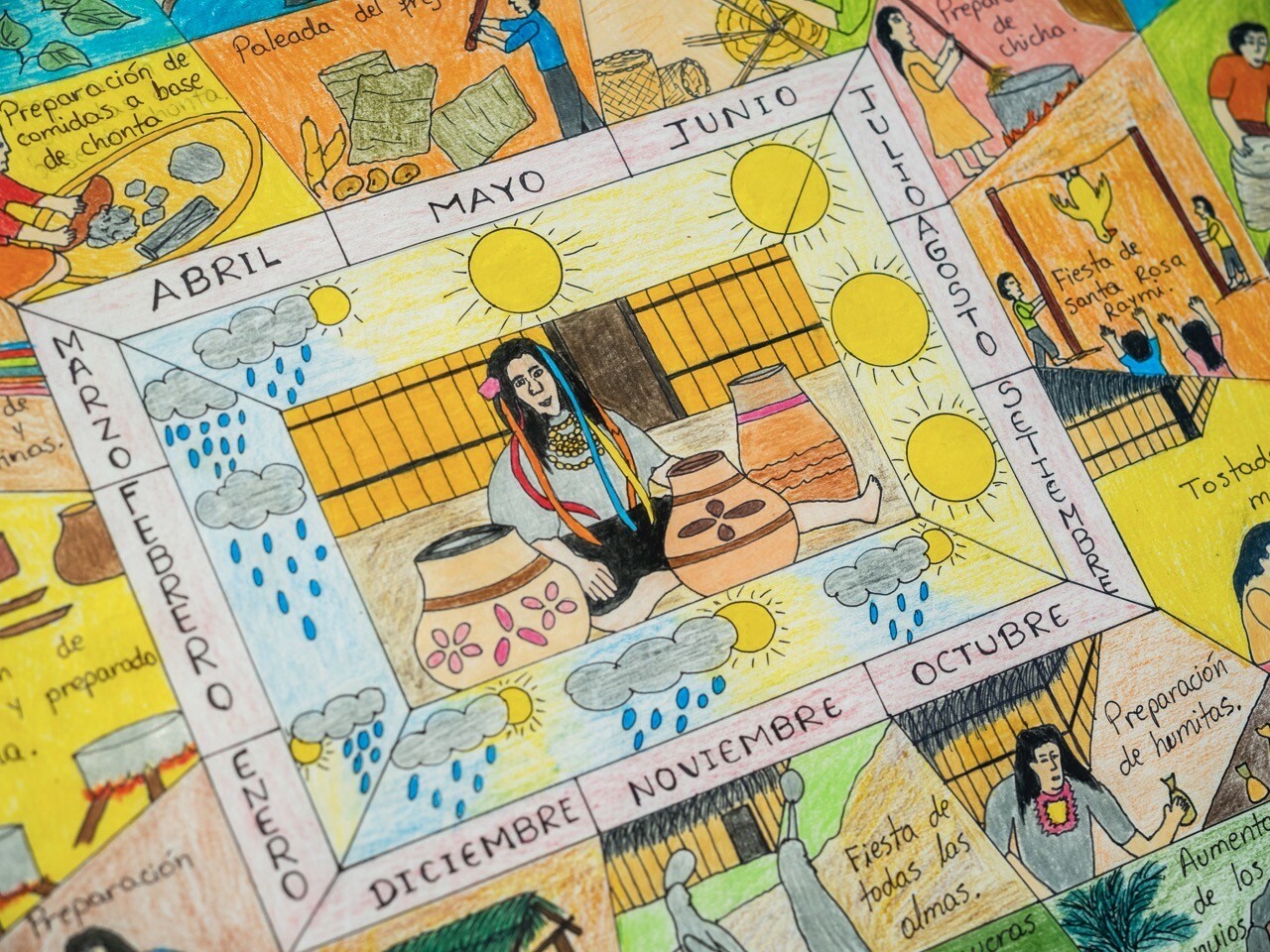 Waman Wasi ist eine kleine NGO in der Region San Martín im Amazonasgebiet Perus. Seit 2002 widmet sie sich der generationsübergreifenden Bildung, dem Wissen der Ahn:innen sowie der Pflege von ökologisch nachhaltigen Solidaritätsnetzwerken. Calendario wurde erstmals im Peru-Pavillon der 18. Architekturbiennale in Venedig, 2023, präsentiert. Es zeigt, wie lokale Initiativen weltweite Reichweite haben und die Kommunikation zwischen den Menschen und dem Land vertiefen können. Zunächst als Wissensmatrix diskutiert und dann gemeinsam gezeichnet, dienen diese Kalender den Dorfbewohner:innen dazu, die Aufgabenverteilung innerhalb der Gemeinschaft und in allen vier eng miteinander verbundenen Lebensräumen – Haus, Chakra (Garten), Wald und Wasser – im Einklang mit den Zyklen von Sonne und Mond abzubilden.