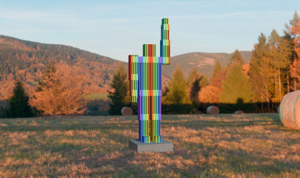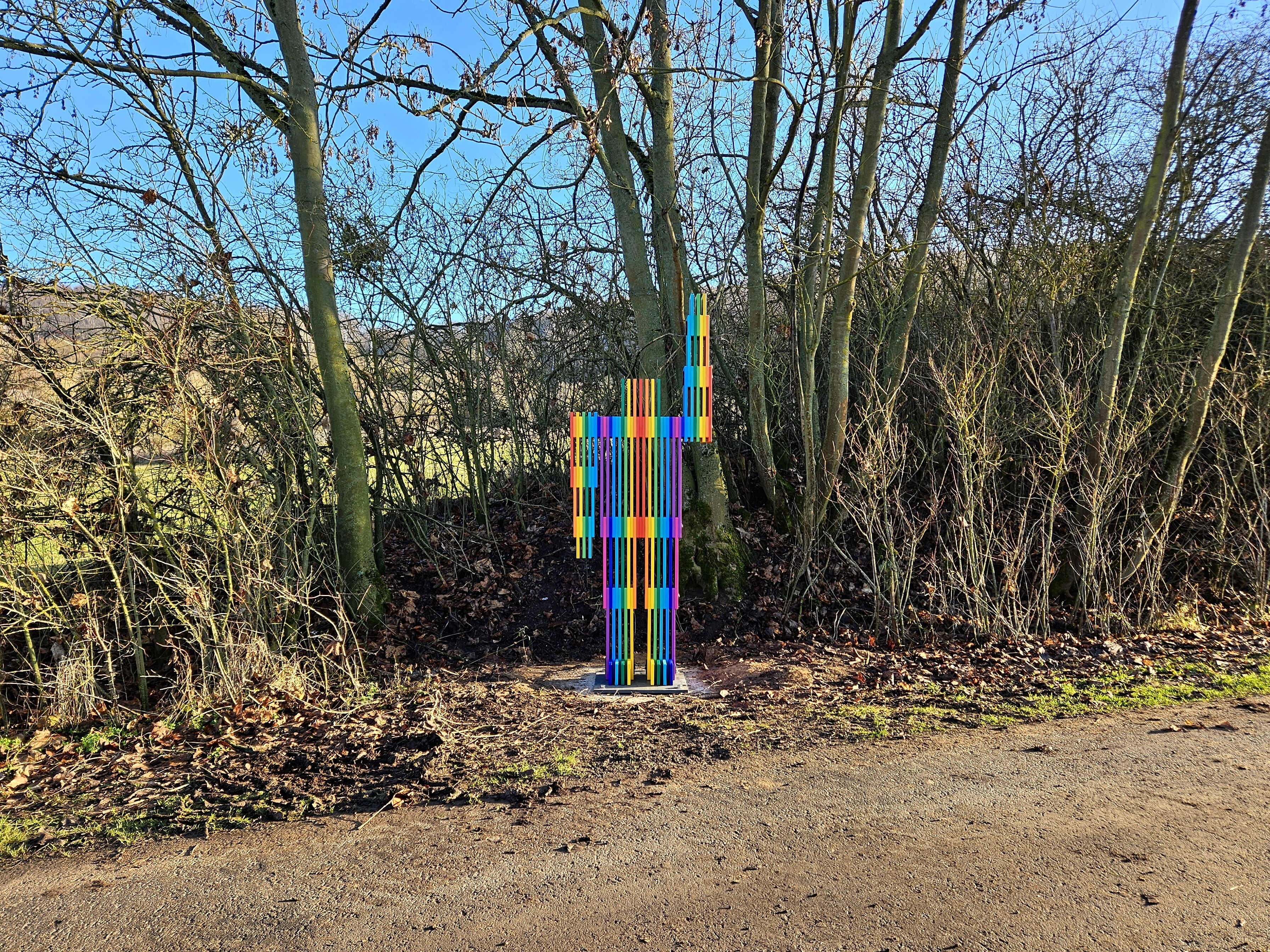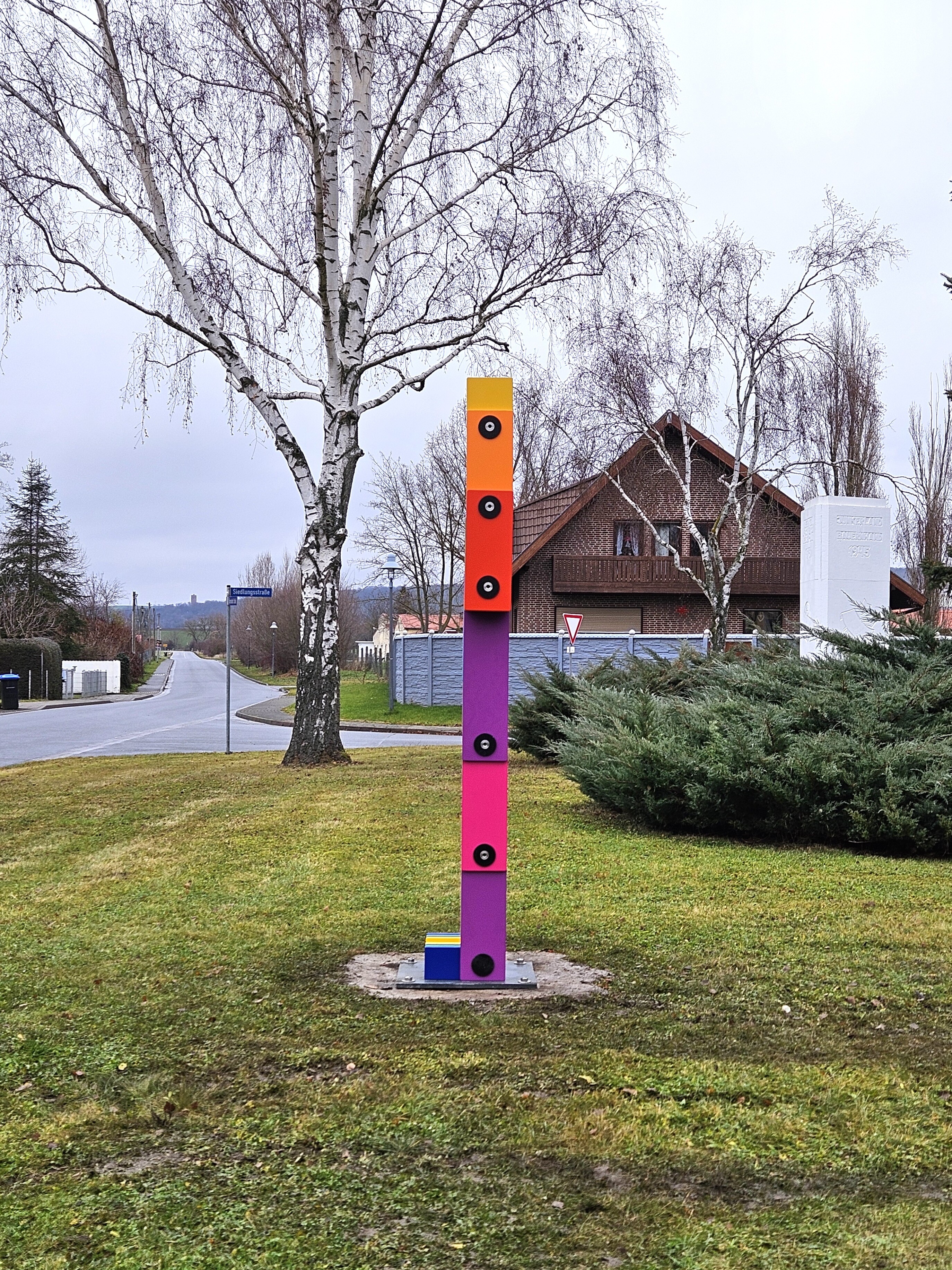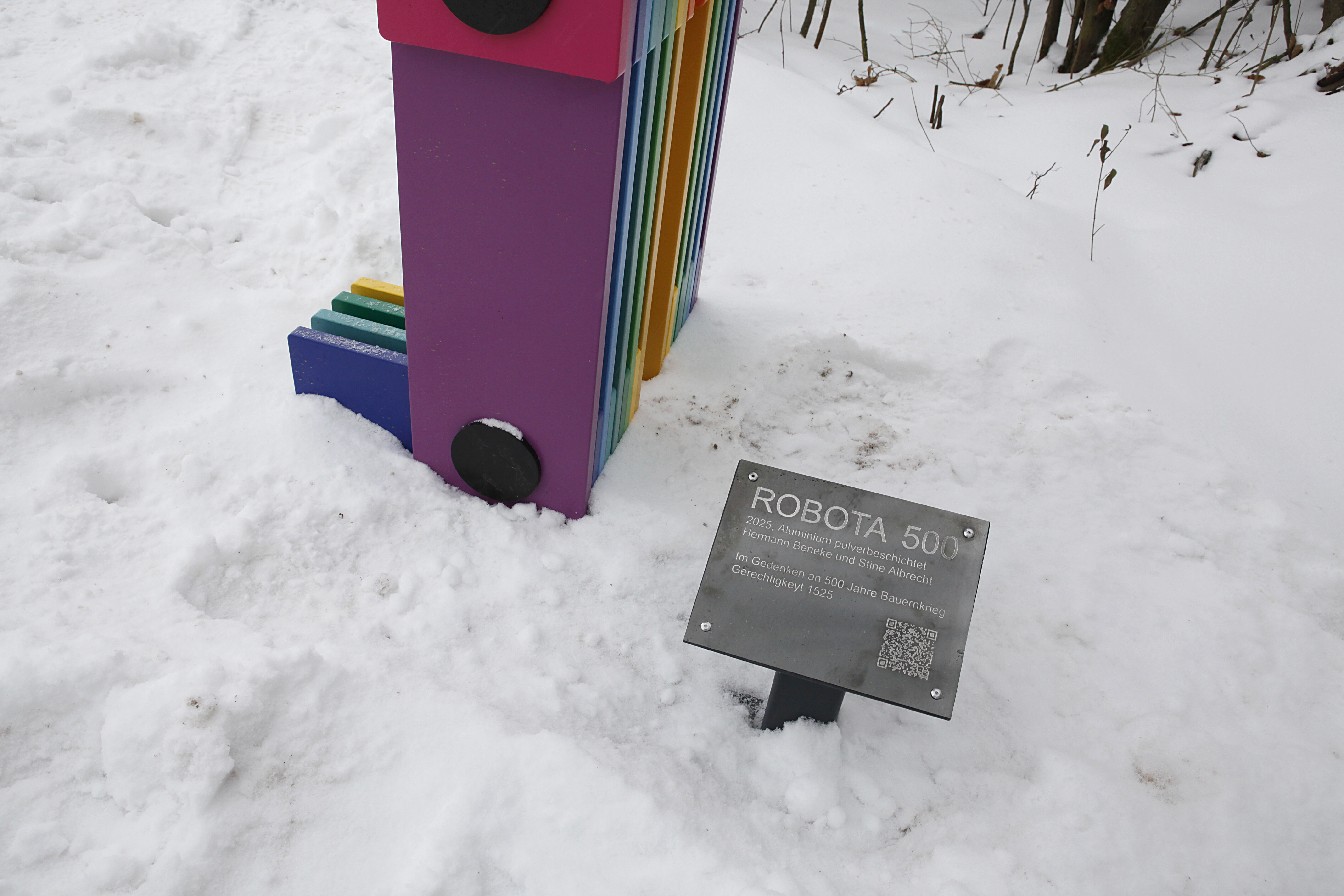 Robota 500 von Stine Albrecht und Hermann Beneke ist eine 270 cm hohe Metallplastik aus vertikal geschichteten Aluminiumplatten, die eine humanoide Figur darstellt. Sie ist farbig im Spektrum des Regenbogens gefasst. Der Regenbogen, wie ihn Thomas Müntzer und seine Getreuen 1525 auf ihren Fahnen getragen haben steht für den Bund Gottes mit den Menschen. Er verleiht den Gläubigen Zuversicht, so die Geschichte Noahs und seiner Söhne, die nach dem Ende der Sintflut die Völker der Erde bildeten. Somit steht der Regenbogen für Vielfalt und für Freiheit zur Vielfalt. Als solch vielstimmiges Symbol leuchtet er in unsere Gegenwart hinein.