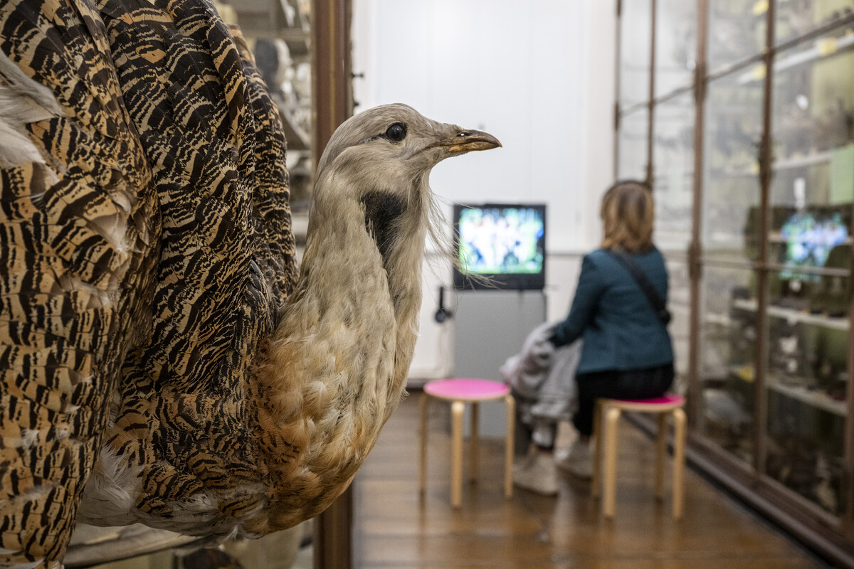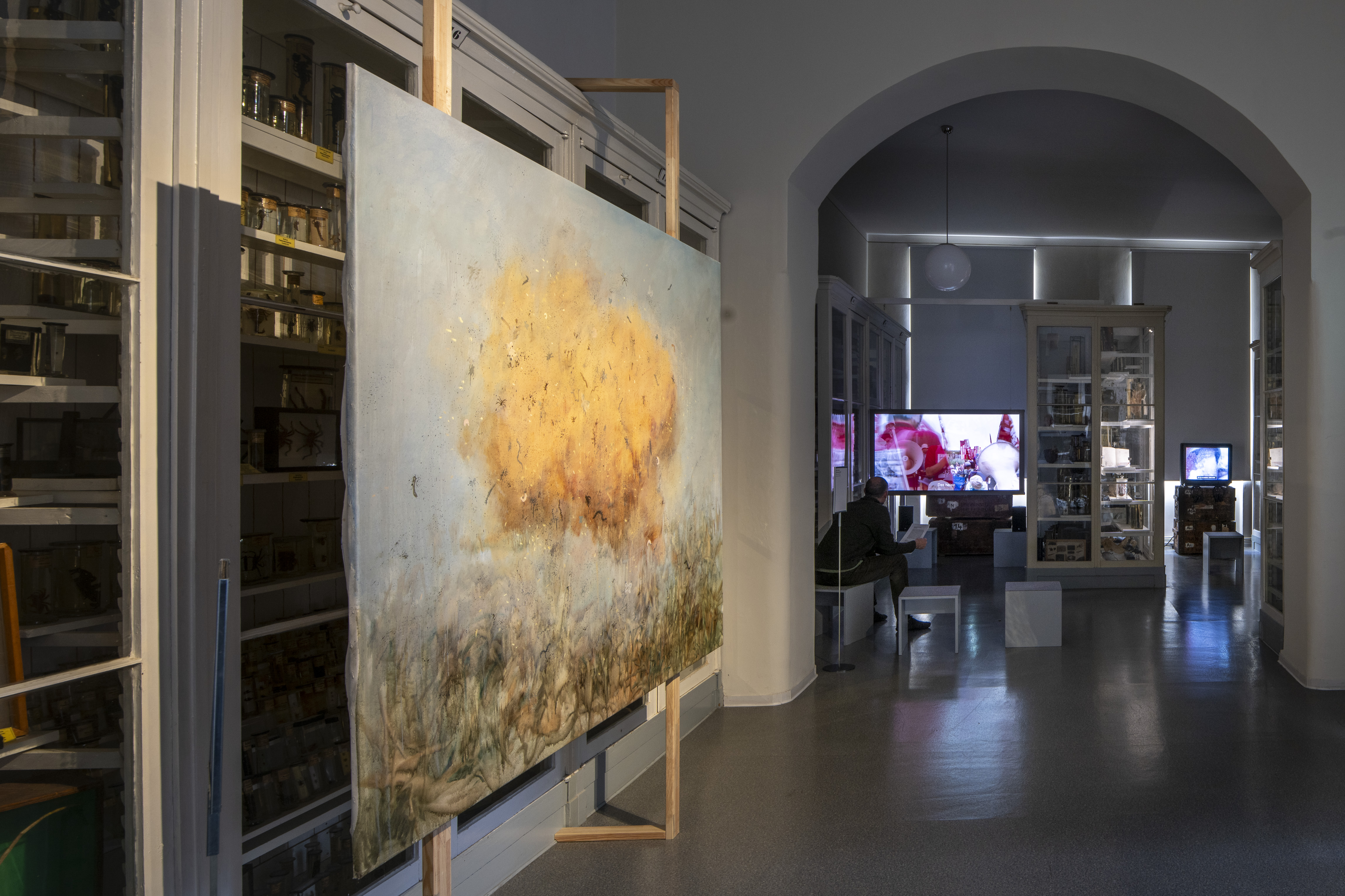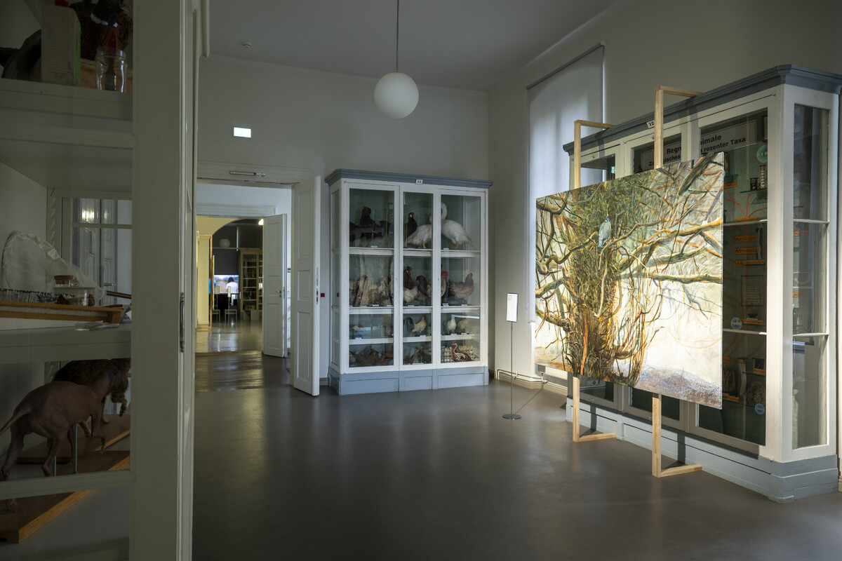 Die Schrankvitrinen der Zoologischen Sammlung beherbergen unzählige Objekte, unter ihnen auch eine Vielzahl landwirtschaftlicher Modelle und Präparate von Nutztieren der Haustierkundlichen Sammlung. Sie bilden den inhaltlichen Kontext für künstlerische Interventionen, die unsere aktuelle Vorstellung von Natur untersuchen und bäuerliche Praxen dokumentieren – zwischen Stadt und Land, kooperativer Bewirtschaftung und politischem Widerstand. Präsentiert werden die eigens für Planetarische Bauern produzierten Arbeiten der Malerin Kateryna Aliinyk und des Fotografen Jochen Lempert, zwei filmische Installationen von Nina Fischer & Maroan el Sani sowie von Salka Tiziana und Julia Ábalos Reznak und der dokumentarische Kurzfilm Agris von Lisa Liepelt. In der raumgreifenden interaktiven Medieninstallation von Clemens Stachel und Wolfgang Konrad debattieren Expertinnen und Experten aus verschiedenen Teilen der Erde über die Zukunft der Welternährung. Neben den zeitgenössischen Werken legen zwei Filme von Siegfried Bergmann eine historische Spur zu den Bemühungen in der späten DDR wie im frühen wiedervereinigten Deutschland, dem Umweltschutz gegen die Interessen von Agrarindustrie und Bergbau Gehör zu verschaffen.